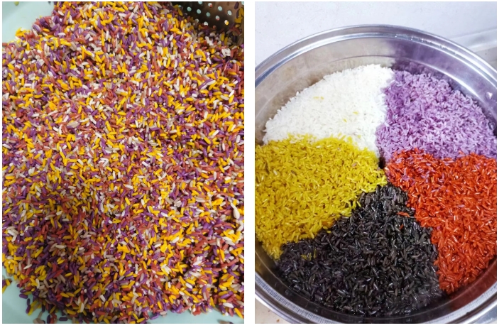 前兩期展示的糯米飯為經(jīng)過創(chuàng)意加工后的樣式,而常見的五色糯米飯,是采用天然植物染成黑、紅、黃、白、紫這5種顏色而成。
